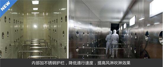 风淋室是人进入洁净室所必需的通道,它可以减少进出洁净室所带来的污染问题,减少由于人货进出带来的大量尘埃粒子由洁净室的入口处安装功能齐全的“气闸室”可以减少空气污染微粒的数量,当人货通过风淋室时,污染微粒被经过过滤的高度洁净空气射掉,25m/s以上的高风速确保了有效的喷射和飘移微粒经过初效和两级过滤器基本过滤掉。为了保持风淋的安全使用,保持洁净室环境的洁净度。
